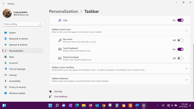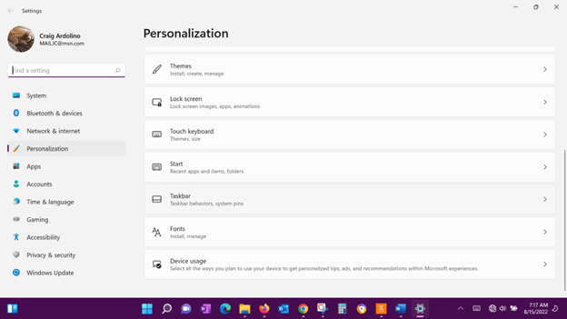 Step 2) Scroll down and Left-Click on the work “Taskbar.”