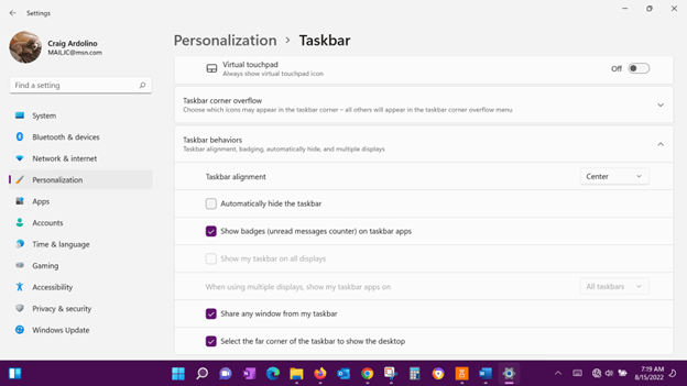 Step 4) Under the caption “Taskbar Alignment” click on the box that says center and change it to Left